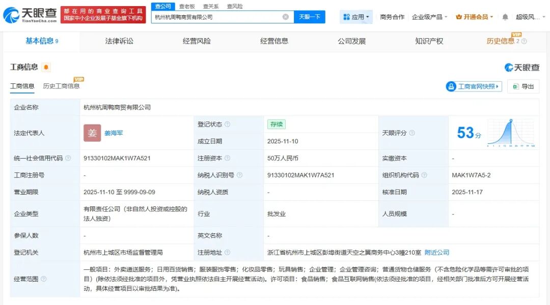 股东信息显示,该公司由湖北周黑鸭管理有限公司全资持股