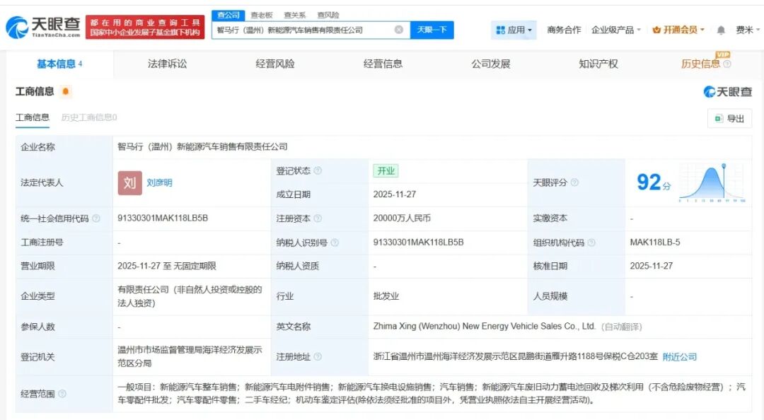 近日,智马行(温州)新能源汽车销售有限责任公司成立,股东信息显示,该公司由威马汽车制造温州有限公司全资持股