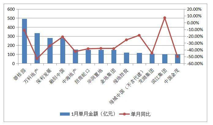 事实上今年1月,中国房地产市场销售整体开局不佳。根据克而瑞对45家典型上市房企数据的统计,单月销售金额同比变动幅度为“正”的仅有滨江集团(002244.SZ)、力高集团(1622.HK)和建业集团(不含代建),同比增幅为7.1%、0.8%、42.2%,其余42家房企均出现不同程度降幅,绿城中国(不含代建)降幅处在中游水平,为-18.7%。