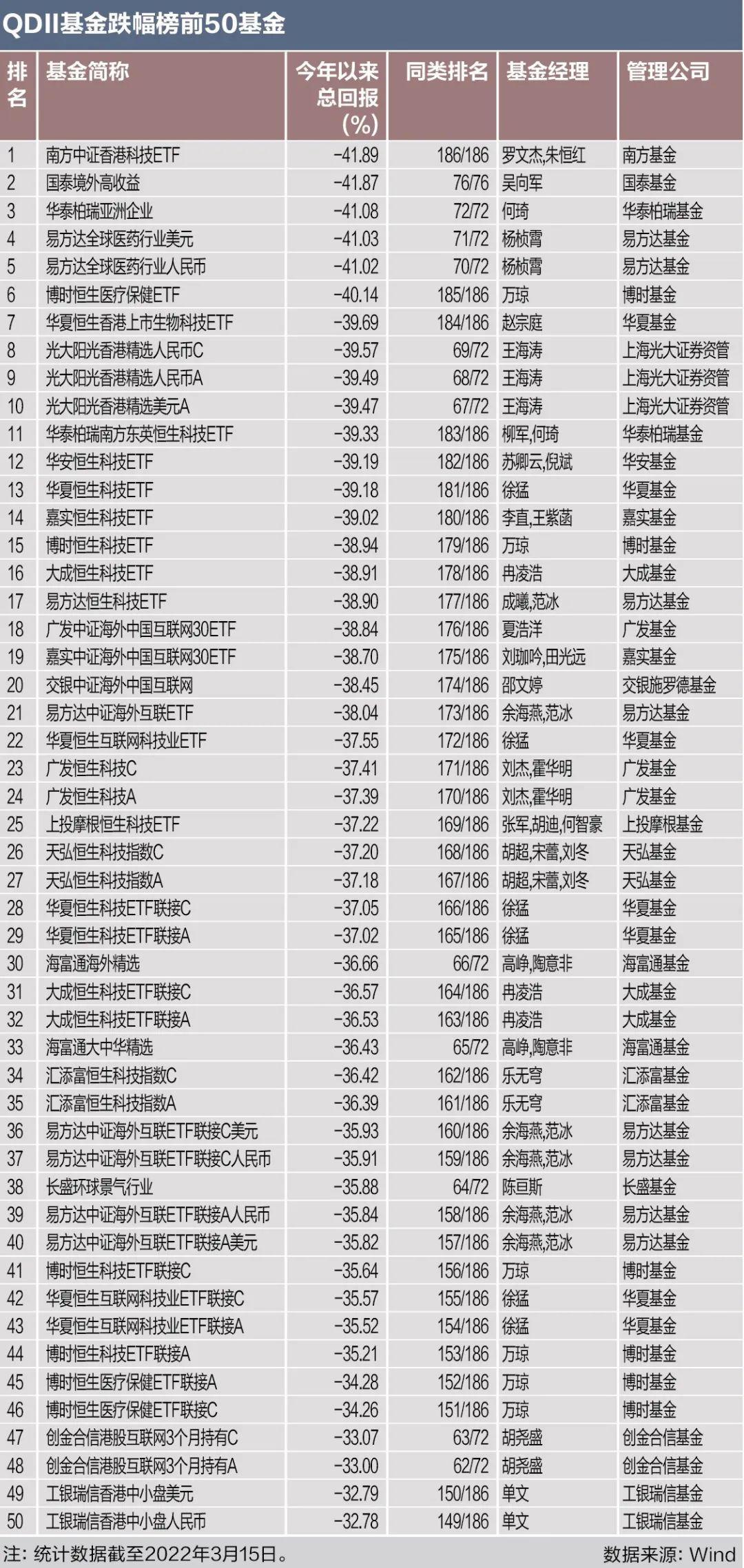 按照今年以来基金净值跌幅由高至低排名,《投资时报》推出《基金跌幅榜》。结果显示,在QDII基金组别,南方中证香港科技ETF以-41.89%的净值跌幅居于榜首。此外,易方达全球医药行业人民币、国泰境外高收益、华泰柏瑞亚洲企业等100只基金的净值也跌超25%。