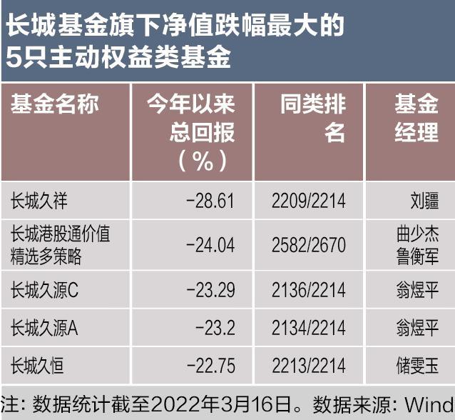 按照今年以来基金净值跌幅由高至低排名,标点财经研究院联合《投资时报》推出了《基金跌幅榜》。结果显示,截至3月16日,长城基金管理有限公司(下称长城基金)旗下共有62只可统计今年以来净值增长率的主动权益类基金(各类份额分开计算),这62只基金年内业绩全部告负,其中46只基金年内净值跌幅超过15%。