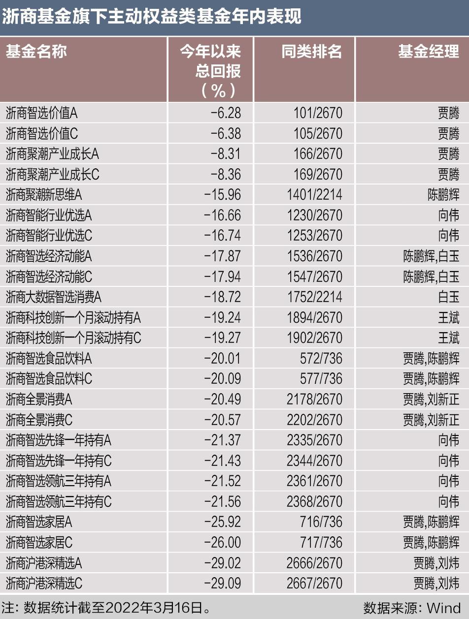按今年以来(截至3月16日,下同)的基金净值跌幅由高至低排名,标点财经研究院联合《投资时报》推出《基金跌幅榜》。《投资时报》研究员注意到,浙商基金管理有限公司(下称浙商基金)旗下主动权益类基金今年以来表现欠佳。Wind数据显示,该公司旗下共有24只主动权益类基金可统计今年以来业绩(各类份额分开计算),而这24只基金年内收益率全部告负。其中,浙商全景消费A/C、浙商科技创新先锋一年滚动持有A/C等20只基金的净值年内下跌超过15%。