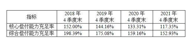 据该公司各年度第4季度偿付能力报告披露,合众人寿2018年—2021年各年度4季度末的核心偿付能力充足率分别为152.00%、144.16%、133.31%、117.35%,综合偿付能力充足率分别为198.39%、175.08%、159.16%、152.93%。从这个角度来看,该公司过去几年的核心及综合偿付能力充足率在逐渐走低。