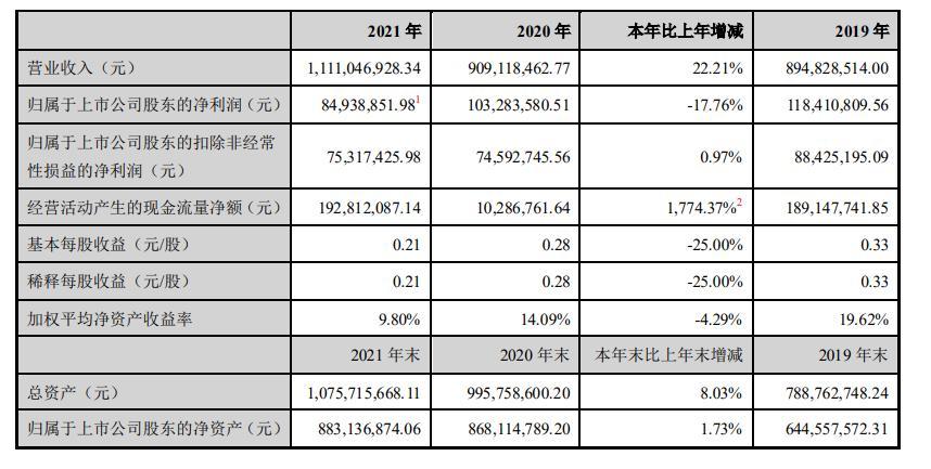 近日,劲仔食品发布了2021年年报。财报显示,该公司全年实现营业收入11.11亿元,同比增长22.21%;实现归母净利润8493.89亿元,同比减少17.76%。