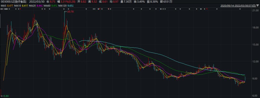 截至3月30日收盘,劲仔食品报收于8.75元/股,较历史最高点下挫57.89%,当前总市值为35.28亿元。