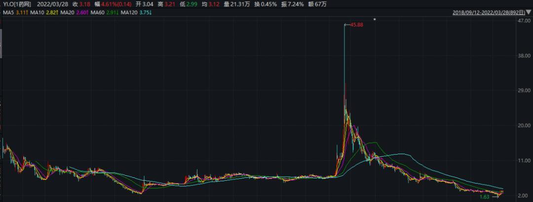 截至3月29日美股收盘,1药网报收于3.06美元/股,已较2021年2月16日的27.33美元/股最高收盘价缩水88.8%,公司当前总市值为2.54亿美元。