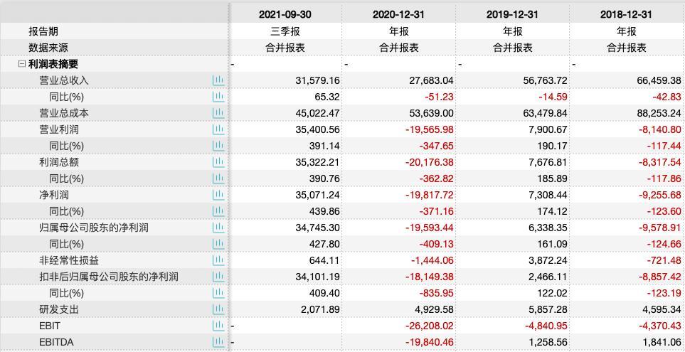 可以看出,该公司前三季度归母净利润3.47亿元超出了营收3.16亿元,营业总成本4.5亿元也远超营收3.16亿元。那么,公司在成本上超出的1.34亿元,又是通过什么收入进行了抵偿且帮助公司扭亏为盈?