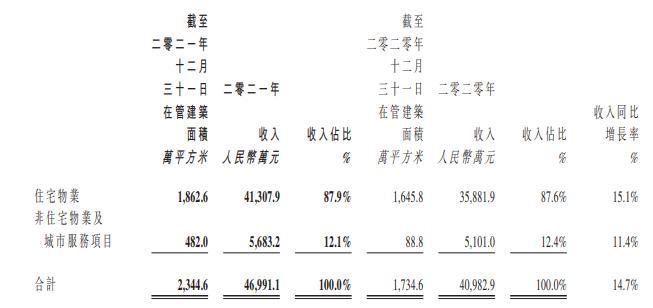 截至2021年末,该公司住宅物业在管建筑面积1862.6万平方米,收入4.13亿元;非住宅物业及城市服务项目的在管建筑面积为482.0万平方米,较上年末大增近400万平方米,但录得收入5683.2万元,仅较上年略增不到600万元。