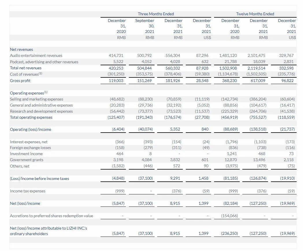 近日,知名UGC音频社区荔枝(LIZI.O)发布了截至2021年年末的2021年第四季度及全年未经审计财务报告。