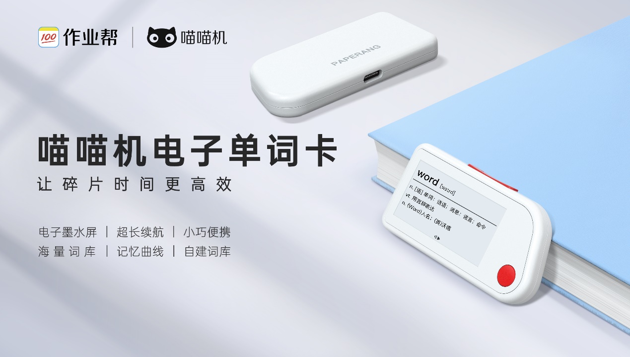 作业帮此次推出的喵喵机电子单词卡是介于纸质与电子产品之间的一款产品,超长续航+电子墨水屏设计,既最大程度保护学生视力,还原纸质感的体验,又免除了频繁充电的烦恼。