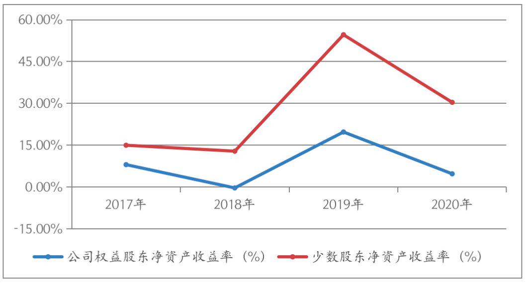 值得注意的是,2020年其业绩也出现滑坡,收入与年度溢利“双降”。但相较其年度溢利同比减少60.1%而言,其少数股东应占年度溢利同比下滑仅40.02%。不仅如此,如若再用净资产收益率来衡量回报率,截至2020年12月31日,其少数股东的净资产收益率(摊薄)为30.35%,远高出公司权益股东的净资产收益率(摊薄)近26个百分点,而此现象已经延续几年。