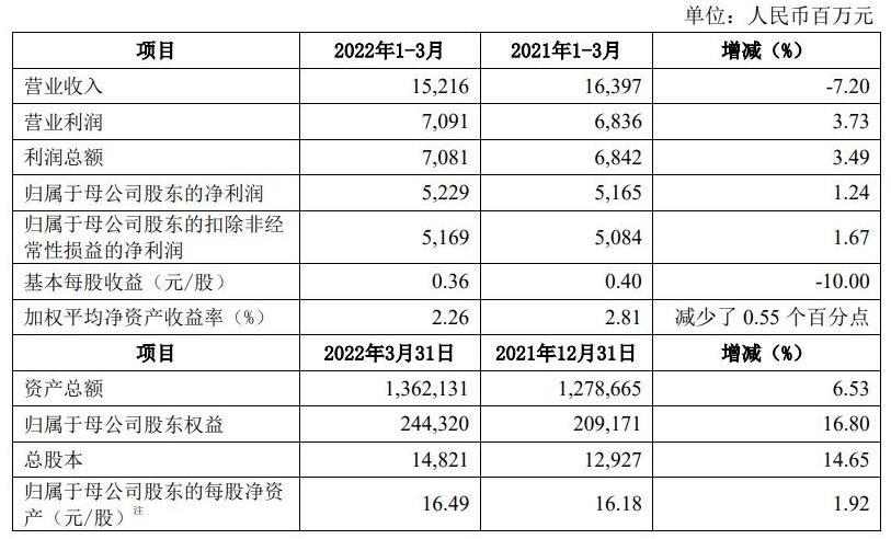 中信证券2022年第一季度主要财务数据和指标(合并口径,未经审计)
