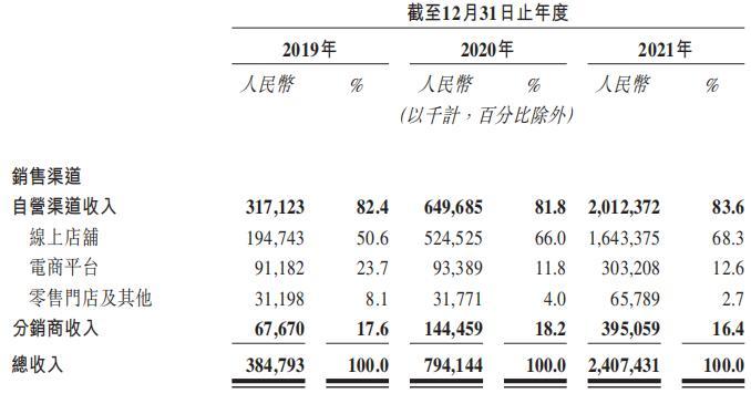 不仅如此,蕉下营收也十分依赖线下销售渠道。该公司在招股书中提到,“要拓展线下销售网络,计划在中国人口密集的一二线城市及其他具有消费潜力的城市大型商业中心和购物广场开设零售门店,以扩大对本地客户的覆盖与影响力。”事实上,蕉下的线下门店数量确实在增加。报告期内,公司零售门店的数量分别为39家、42家及66家。分销商数量也从2019年的96家增长至2021年的982家。