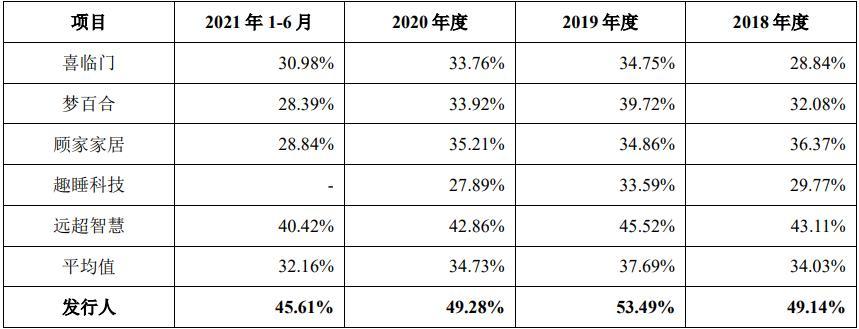 报告期内,同行业可比公司毛利率均值分别为34.03%、37.69%、34.73%、32.16%,慕思股份综合毛利率明显高于行业均值,均超出了十几个百分点。
