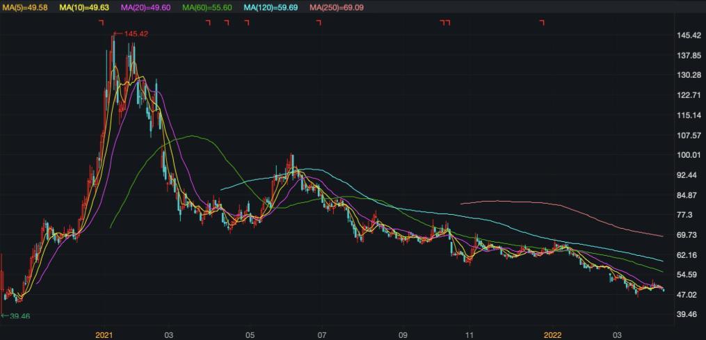 截至2022年4月6日收盘,该公司股价报收于49.25元/股,累计跌幅超66.13%,市值为2670亿元,较高点已蒸发超5000亿元。