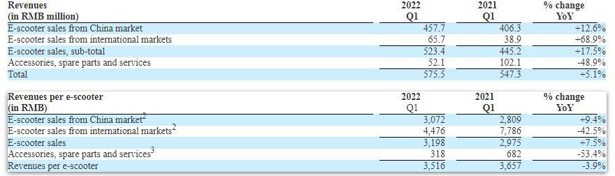 国际市场的销量增速则有正有负,但2021年第四季度、2022年第一季度,国际市场销量为3.29万辆、1.46万辆,连续两季度销量增速喜人,同比增长1.56倍、1.94倍。但需指出的是,国际市场每台电动两轮车的销售收入由2021年第一至第三季度的7786元、8259元、8693元,降至第四季度5749元。