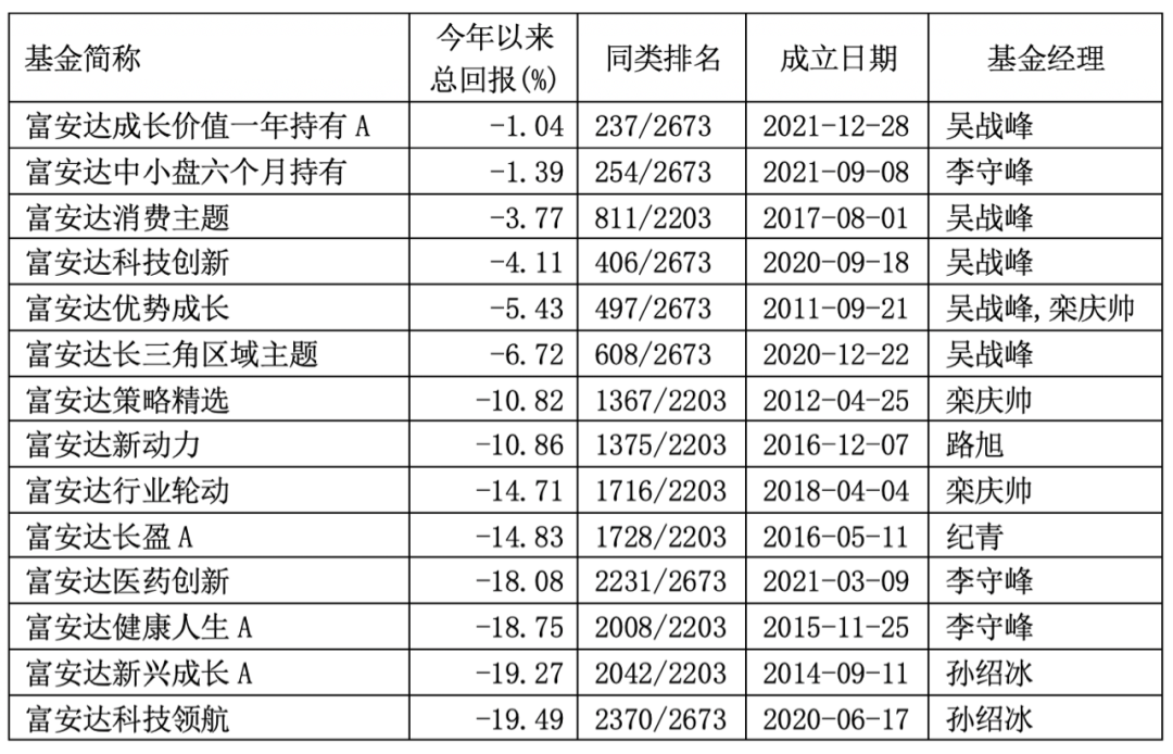 今年以来,主动权益类基金业绩两极分化明显。如果对主动权益类基金年内净值跌幅15%及以上进行统计,《投资时报》研究员发现,富安达基金旗下有富安达新兴成长A、富安达科技领航、富安达健康人生A、富安达医药创新4只主动权益类基金现身其中。
