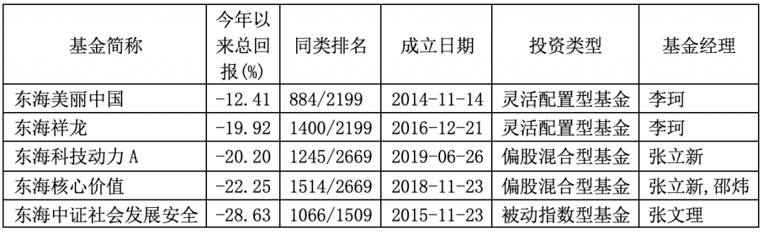 Wind数据显示,截至9月30日,该公司旗下5只权益类产品年内净值跌幅均超过10%(只统计主代码基金,下同,剔除偏债混合型基金),其中,东海科技动力A、东海核心价值、东海中证社会发展安全同类排名皆在后1/2。除了东海中证社会发展安全是指数型基金外,其余4只产品均是主动权益类基金。
