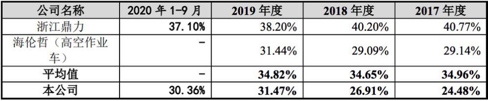 报告期内,该公司毛利率分别为24.48%、26.91%、31.47%和30.36%,虽有所增长,但均低于34%左右的行业均值。其中,龙头企业浙江鼎力2017年、2018年各年毛利率甚至高出星邦智能近20个百分点。
