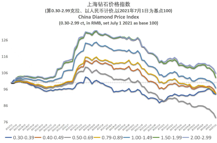 国际钻石交易所(IDEX)官网显示,全球毛坯钻石价格较去年三月的历史高点已下跌25%。上海钻石交易所披露的上海钻石价格指数显示,目前钻石价格处于近两年的最低位,相比2022年的价格高位下降幅度超过20%。