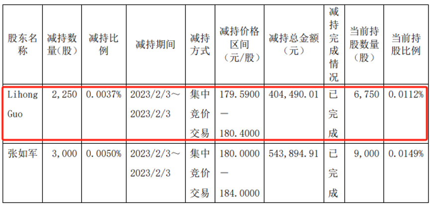 键凯科技公告显示,公司于2023年2月3日收到Lihong Guo出具的《关于股份减持结果的告知函》,其通过集中竞价方式减持股份2250股,占公司总股本的0.0037%。公告显示,键凯科技实际控制人暨控股股东XUAN ZHAO与Lihong Guo为配偶关系,存在一致行动关系。