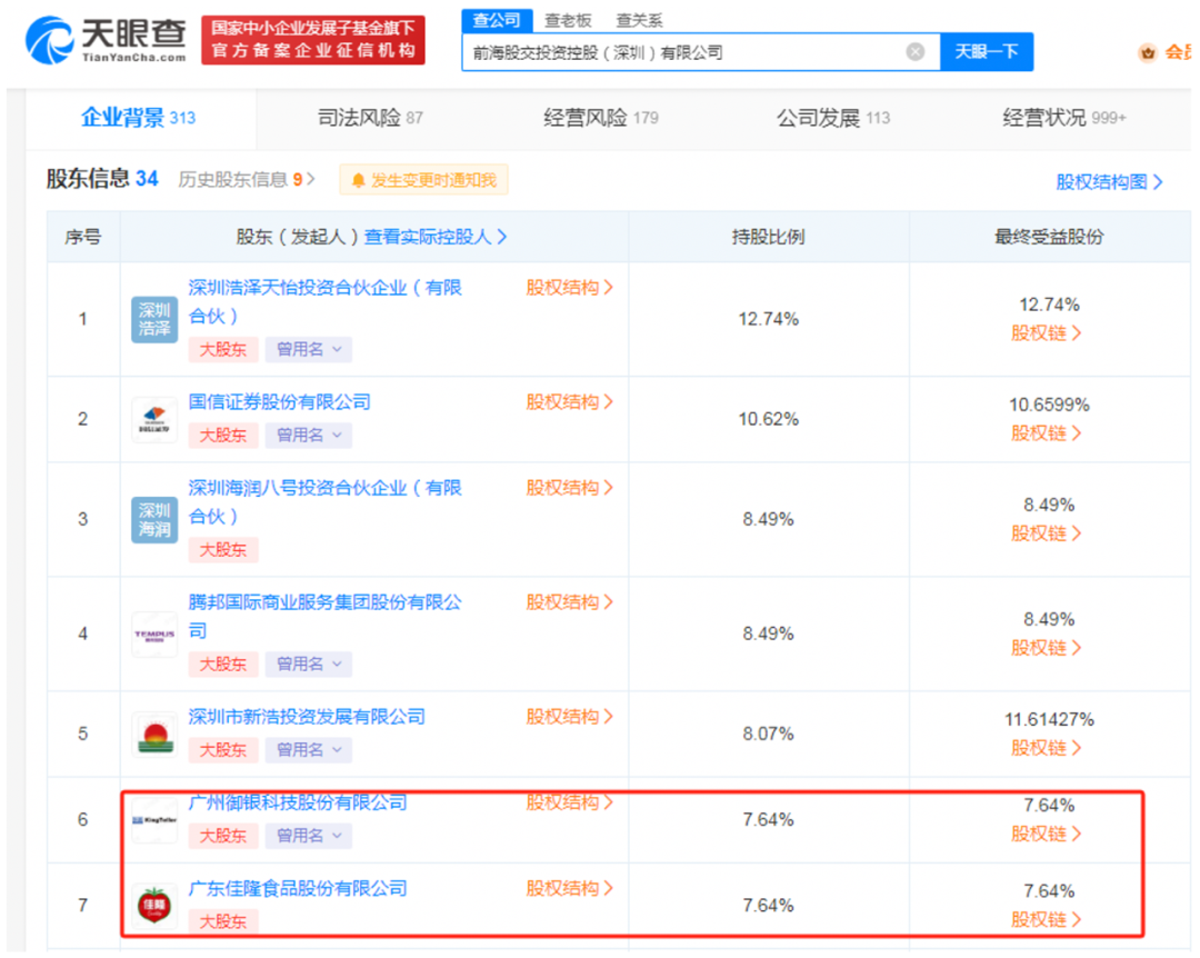 值得注意的是,参股前海股交投资的企业并非佳隆股份一家,御银股份(002177.SZ)也是其中之一。公开资料显示,前海股交投资为御银股份的参股公司,持有其7.64%股权。