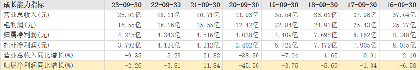 而公司业绩下滑趋势此前已有所显现。《投资时报》研究员注意到,除2021年前三季度外,公司自2016年前三季度至2023年前三季度同期的归母净利润均出现同比下滑。