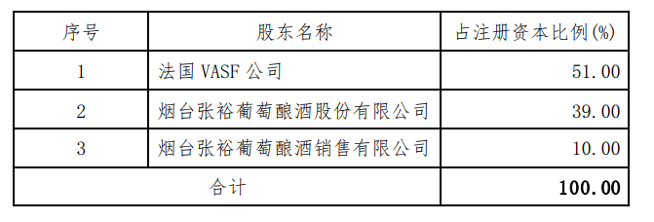 廊坊酿酒公司前身为法国红城堡廊坊酿酒有限公司,成立于2002年3月,注册资本为300万美元,由法国VASF公司、张裕A和张裕销售公司分别出资153万美元、117万美元、30万美元共同设立,三者占注册资本的比例分别为51%、39%、10%。