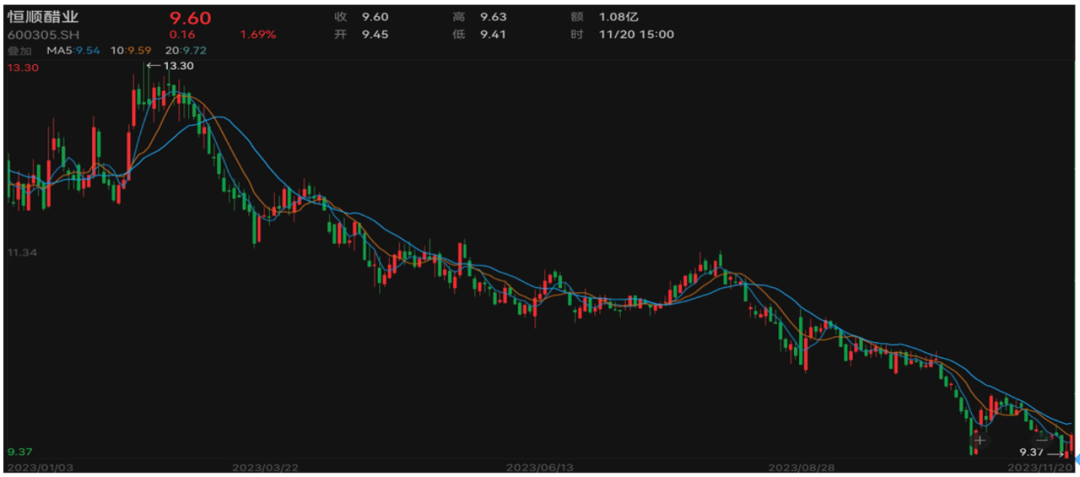 值得一提的是,11月17日,恒顺醋业向特定对象发行的1.1亿股限售股份解禁并上市流通,解禁股数占公司总股本比例为9.89%,解禁市值约10.38亿元。或受此影响,当日盘中,恒顺醋业股价触及9.37元/股(不复权,下同),创下公司自2019年以来的阶段性新低,此后该股有所回调,报于9.44元/股,这一价格相比2020年8月的最高点27.58元/股,降幅已超65%。