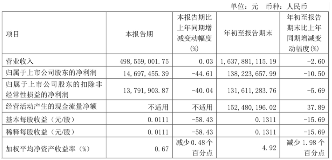 财报数据显示,今年前三季度,恒顺醋业实现营业收入16.38亿元,同比下降2.60%;归母净利润为1.38亿元,同比下降10.50%;扣除非经常性损益净利润达1.32亿元,同比下降5.69%。