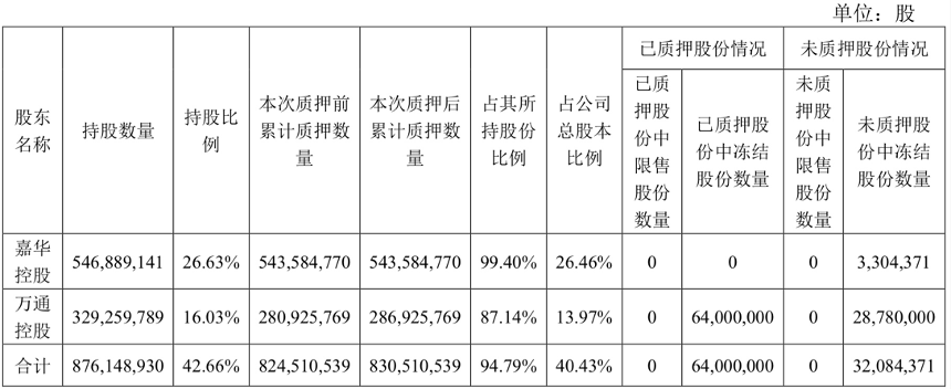 此外,万通发展还存在控股股东高比例质押的情况。公司控股股东嘉华控股及一致行动人万通控股合计持有万通发展8.76亿股,占公司总股本的42.66%。截至11月27日,嘉华控股及万通控股累计质押公司股份8.31亿股,占所持有股份总数的94.79%,占公司总股本比例为40.43%。