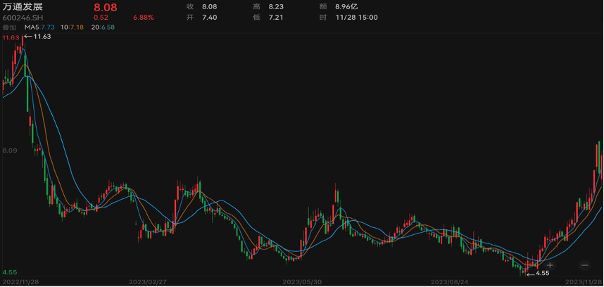 二级市场方面,万通发展股价在过去30个交易日内累计涨幅超过80%。但在发布公告后,该公司股价在11月27日上午开盘不到半小时便触及跌停。截至11月28日收盘,该公司股价报于8.08元/股,单日上涨6.88%,总市值为166亿元。