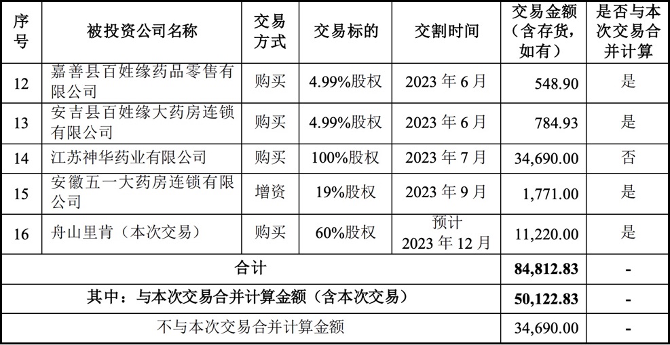 在上述15笔交易中,除江苏神华系医药工业资产外,华人健康其余14笔资产购买,均属于医药零售行业收购事项。这与该公司的舟山里肯交易属于相同或相近业务范围,可认定为同一或相关资产。这14笔交易与舟山里肯交易合并计算,涉及交易金额为5.01亿元。