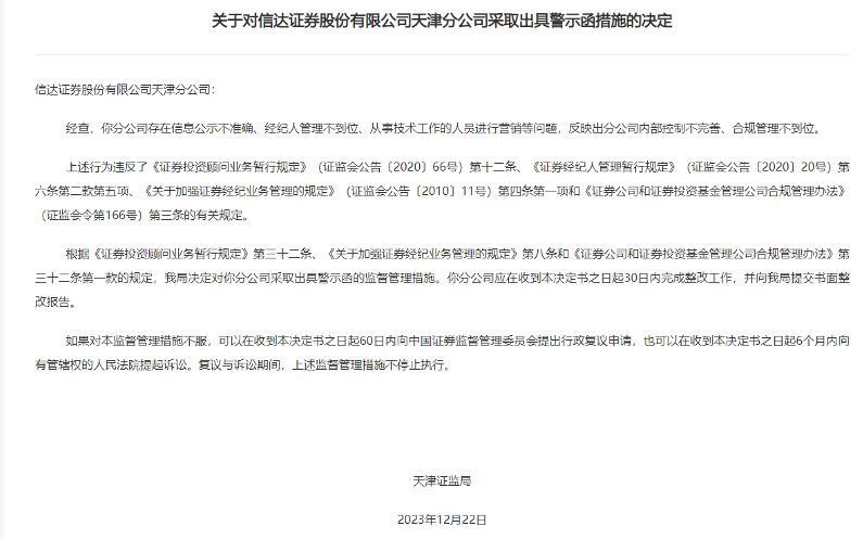 据中国证监会官网信息,2023年12月22日,天津证监局决定对信达证券天津分公司采取出具警示函的监督管理措施。