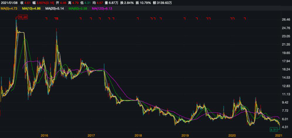 不过近日《投资时报》研究员注意到,这家上市后股价连续涨停、市值曾超过31亿元的珠宝公司股价却逐步走低,2021年1月8日甚至触及4.31元/股历史最低价。同时,在2018年归母净利润还实现2000多万元的情况下,一年后就巨亏3亿元。虽然进入2020年后,其未出现亏损,但业绩始终处于下滑态势。