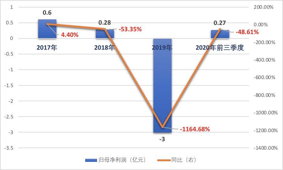 需要注意的是,2020年前三季度,该公司业绩仍未扭转低迷态势。其中,营业收入为8.60亿元,较上一年同期下滑46.51%;归母净利润与上年同期0.52亿元相比,更是几近腰斩,仅有0.27亿元,降幅达46.61%。