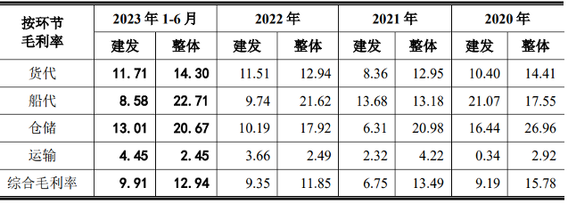 而报告期内侨益股份的主营业务综合毛利率分别为14.19%、13.60%、12.35%和14.09%,毛利率整体呈现下降的趋势,主要由于货运代理、船舶代理、仓储、运输四个环节中货运代理及仓储单位成本上升引起。