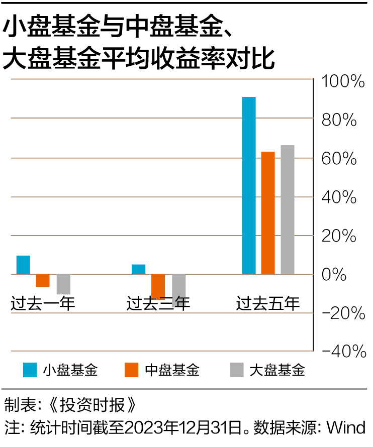 如若将投资年限延长至三年、五年,小盘基金成绩依旧领先于中盘基金和大盘基金。截至2023年末,小盘基金近三年、近五年的平均收益率分别为4.8%、90.94%;中盘基金近三年、近五年的平均收益率分别为-13.37%、66.48%;大盘基金近三年、近五年的平均收益率分别为-16.5%、63.05%。