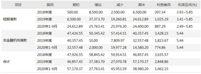 需要注意的是,《回复公告》还显示,标的公司九九久的借款包括短期借款、非金融机构借款,其中,非金融机构借款为向母公司延安必康资金拆借形成。而2018年末至2020年9月末,其非金融机构借款分别为4.04亿元、3.26亿元和1.46亿元;对应各期利息费用依次为3428.23万元、1823.67万元和774.86万元,年利率均为5.44%。