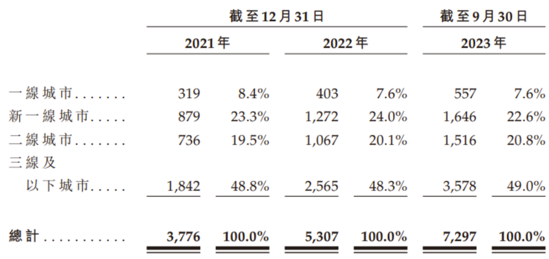 与竞争者类似,沪上阿姨的门店也以加盟模式为主。招股书显示,在沪上阿姨2023年9月末的7297间门店中,7245间为加盟门店,占比高达99.3%。由此,公司的收入也基本来自于加盟业务,报告期各期,来自加盟商的收入分别为15.57亿元、20.72亿元和24.36亿元,占主营收入中的比例分别为95%、94%和96%。