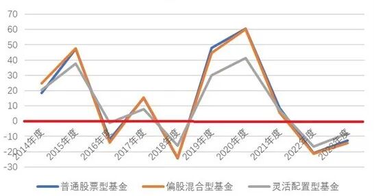 标点财经的研究数据显示,2023年,主动管理型权益类基金中普通、偏股、灵活配置基金的复权单位净值增长率中位值均为负值,分别为-12.62%、-14.37%、-8.20%,继2022年全面亏损之后再度亏损。