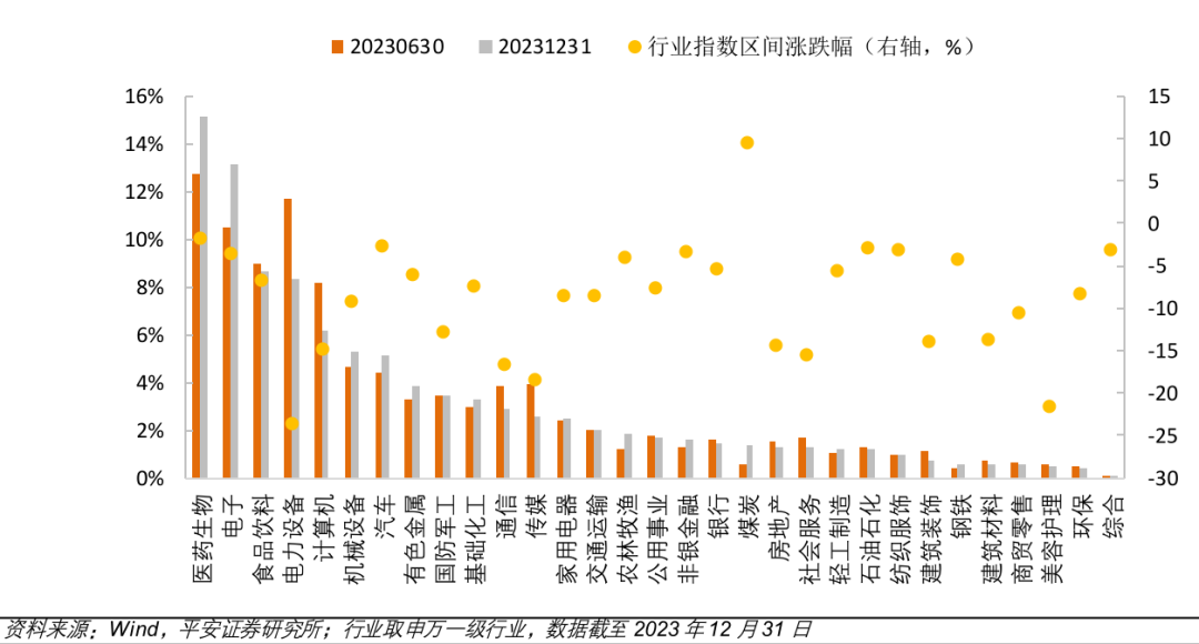 在行业配置方面,平安证券研究报告指出,去年下半年,医药生物维持第一重仓行业不变且持仓占比提升,电子由第三重仓行业提升至第二重仓行业,电力设备遭大幅减持由第二重仓行业降为第四重仓行业,食品饮料被动提升至第三重仓行业,计算机维持第五重仓行业但持仓占比下降。