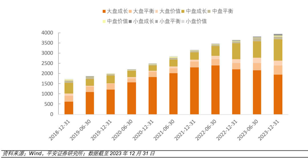统计数据显示,主动权益基金持仓风格仍以大盘成长为主,但大盘成长风格基金的数量占比有所减少。截至 2023 年末,3936 只主动权益基金中,大盘成长风格基金数量1950只,占比达到49.54%,较2023年半年末减少6.80%;中盘成长风格基金数量1022只,占比较 2023 年半年末增加 4.60%。