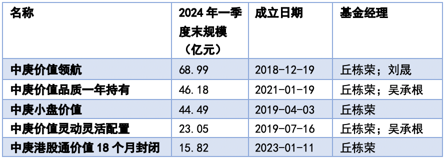 然而,2024年一季度末,中庚基金共有六只基金,管理规模为250.44亿元,丘栋荣所管规模占该公司总规模比例近八成。