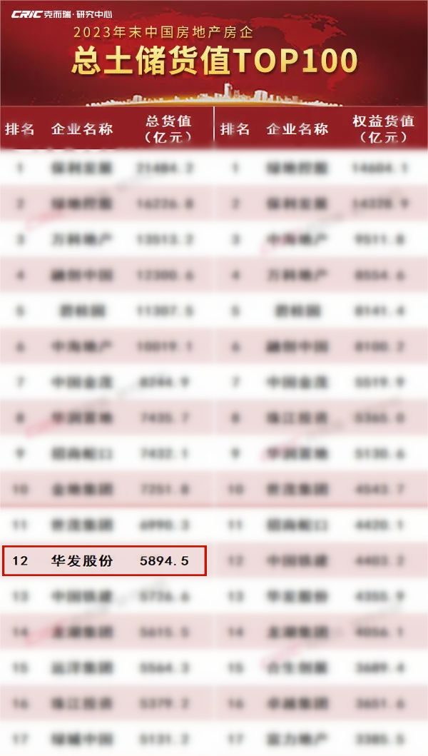 2023年末房企总土储货值下降,然而华发股份却逆流而上,根据克而瑞发布的《2023年中国房企总土储货值排行榜TOP100》,华发股份以5894.5亿的总货值位列第12,较往年上升5位。