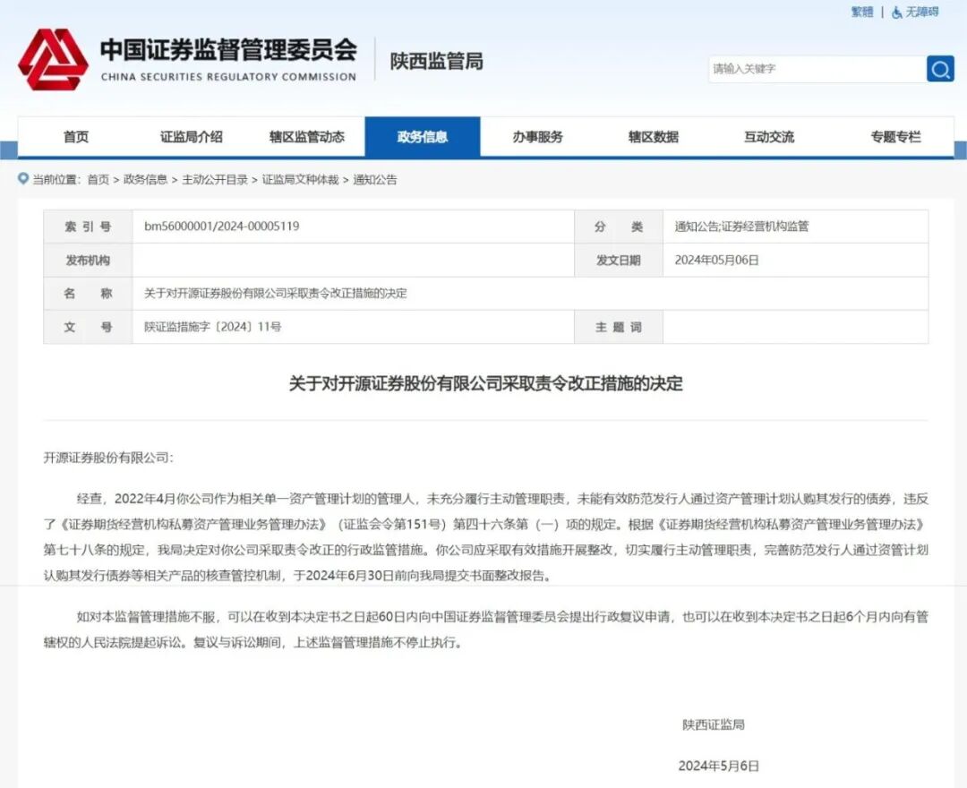 证监会官网信息显示,今年5月6日,陕西证监局决定对开源证券采取责令改正的行政监管措施。