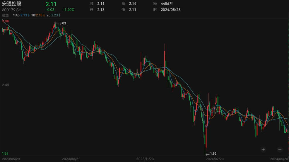 由于本次交易尚处于筹划阶段,存在不确定性,安通控股宣布公司股票自2024年5月29日开市起停牌,预计停牌时间不超过10个交易日。截至停牌前一个交易日,该公司股价报收于2.11元/股,市值为89亿元。