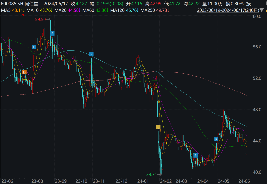 截至6月17日收盘,同仁堂股价收于42.27元/股,与2024年1月3日触及的55.74元/股阶段性高点相比,跌幅达24.17%