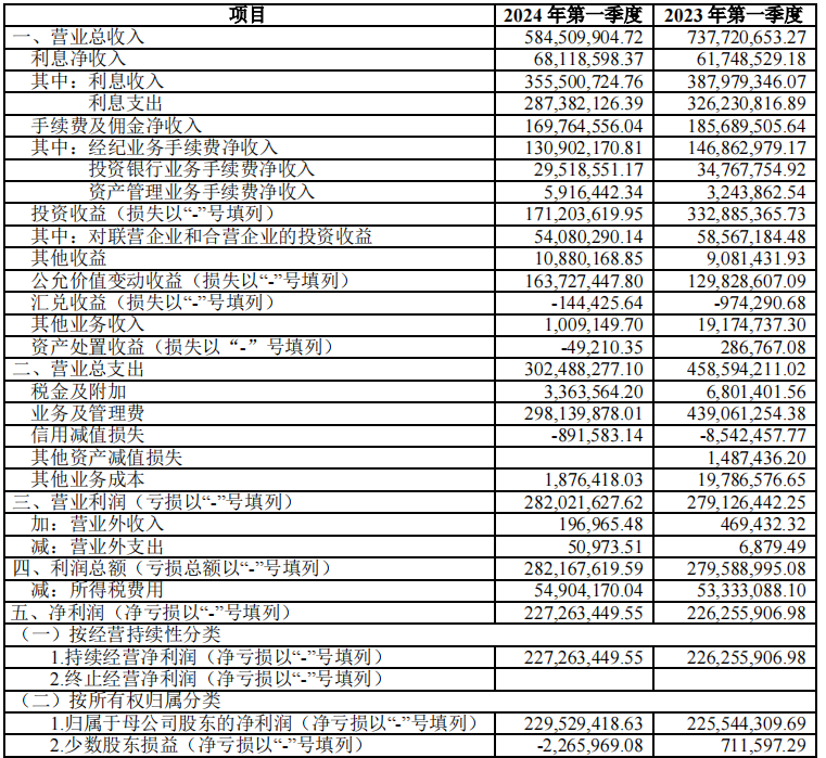 据季报显示,2024年一季度,西南证券净利润小幅上升但营收下滑,其中投资收益、经纪业务手续费净收入、投资银行业务手续费净收入均出现明显下降。