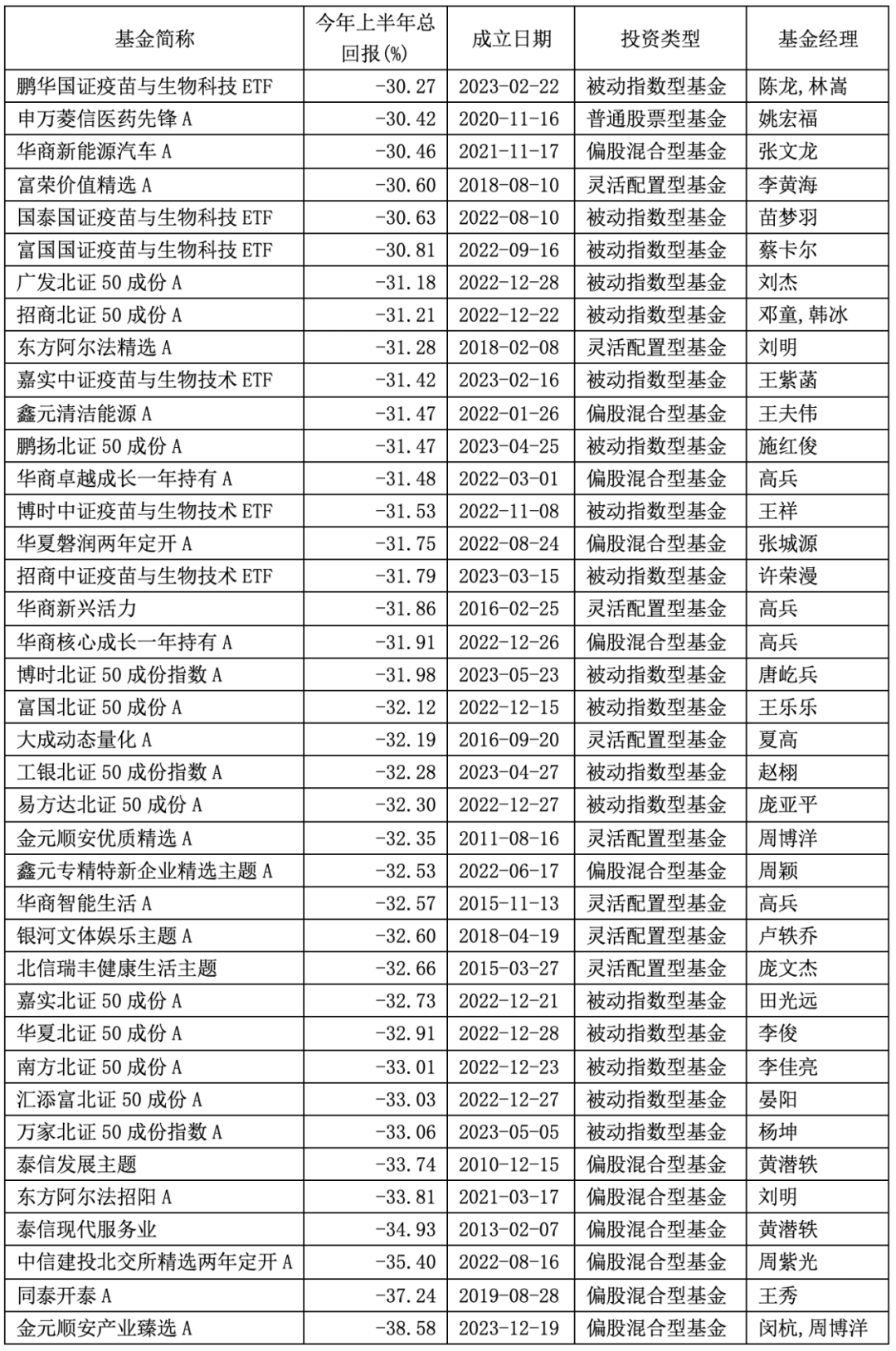 上半年净值跌超30%的基金来自26家公募基金管理机构。其中,华商基金旗下有五只基金现身,分别是华商新能源汽车A、华商卓越成长一年持有A、华商新兴活力、华商核心成长一年持有A、华商智能生活A,上半年收益率分别为-30.46%、-31.48%、-31.86%、-31.91%、-32.57%。